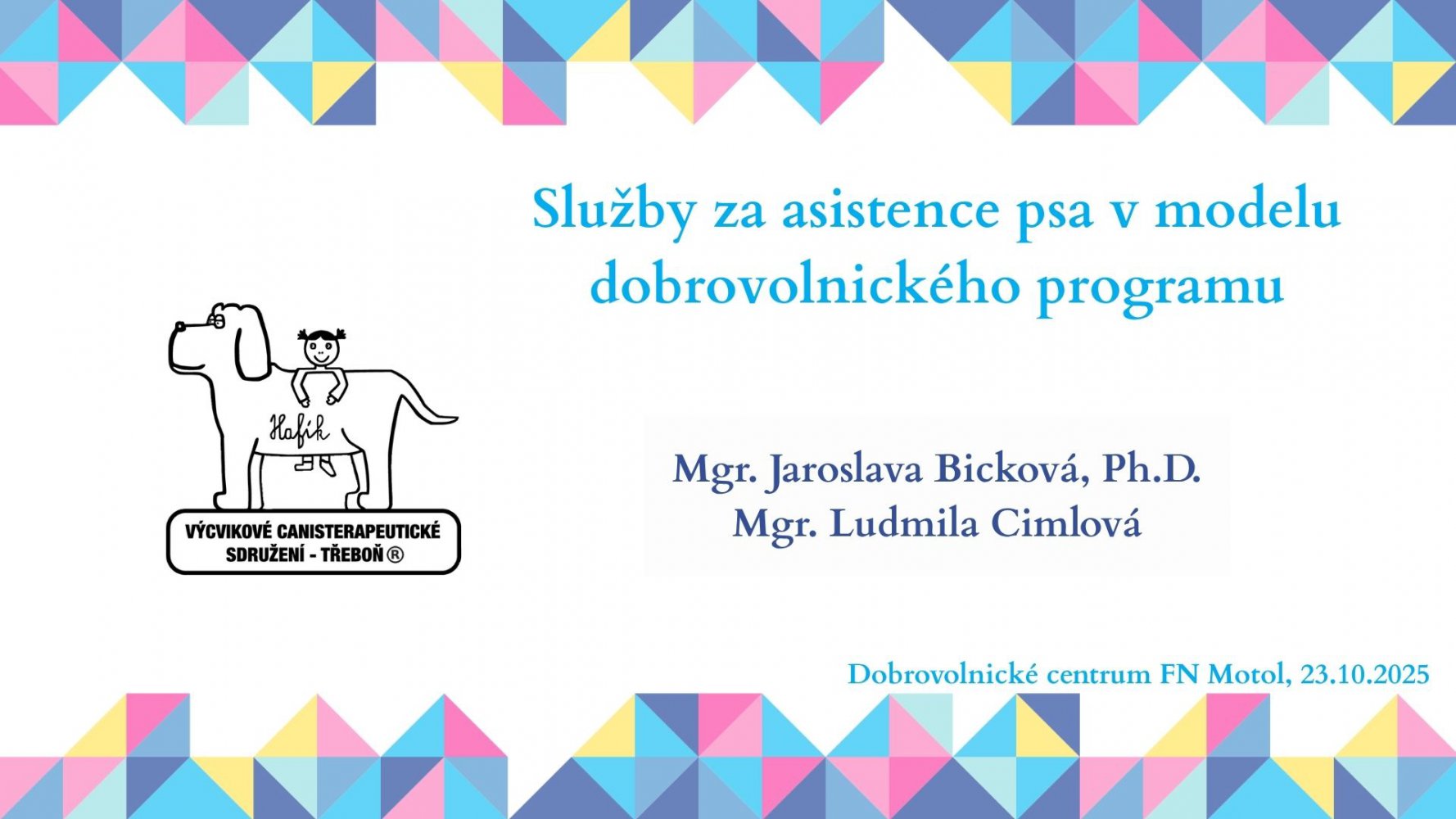 Téma naší přednášky: "Služby za asistence psa v modelu dobrovolnictví ve zdravotnictví"