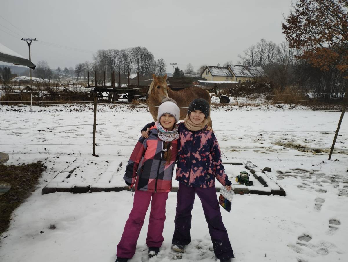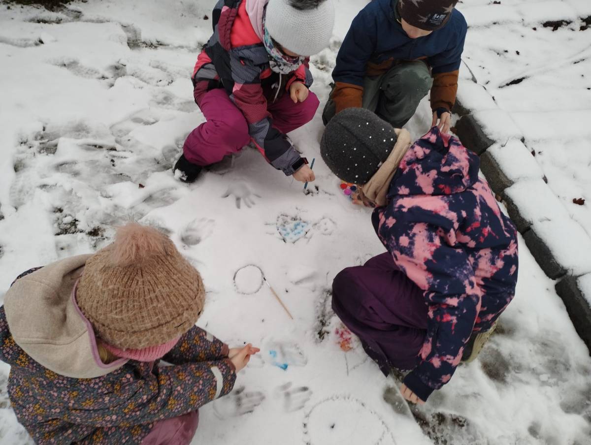 Na jednom ze zimních setkání našeho přírodovědného kroužku jsme si s dětmi užili tvoření ve sněhu – vznikly krásné příběhy se zvířátky a ožil i nedaleký dub, kterému děti s nadšením vytvořily obličej. Vypravili jsme se také do našeho malého zookoutku kousek za vraty, kde jsme se seznámili s novými přírůstky. V jurtě jsme se pak příjemně ohřáli a doplnili energii něčím dobrým. Děti si vyzkoušely i dešťovou hůl, kterou jako správní šamani občas používáme k přivolání deště. Na závěr jsme si otiskli několik zvířecích stop a postavili z mechu a kůry malé domečky pro lesní tvorečky.