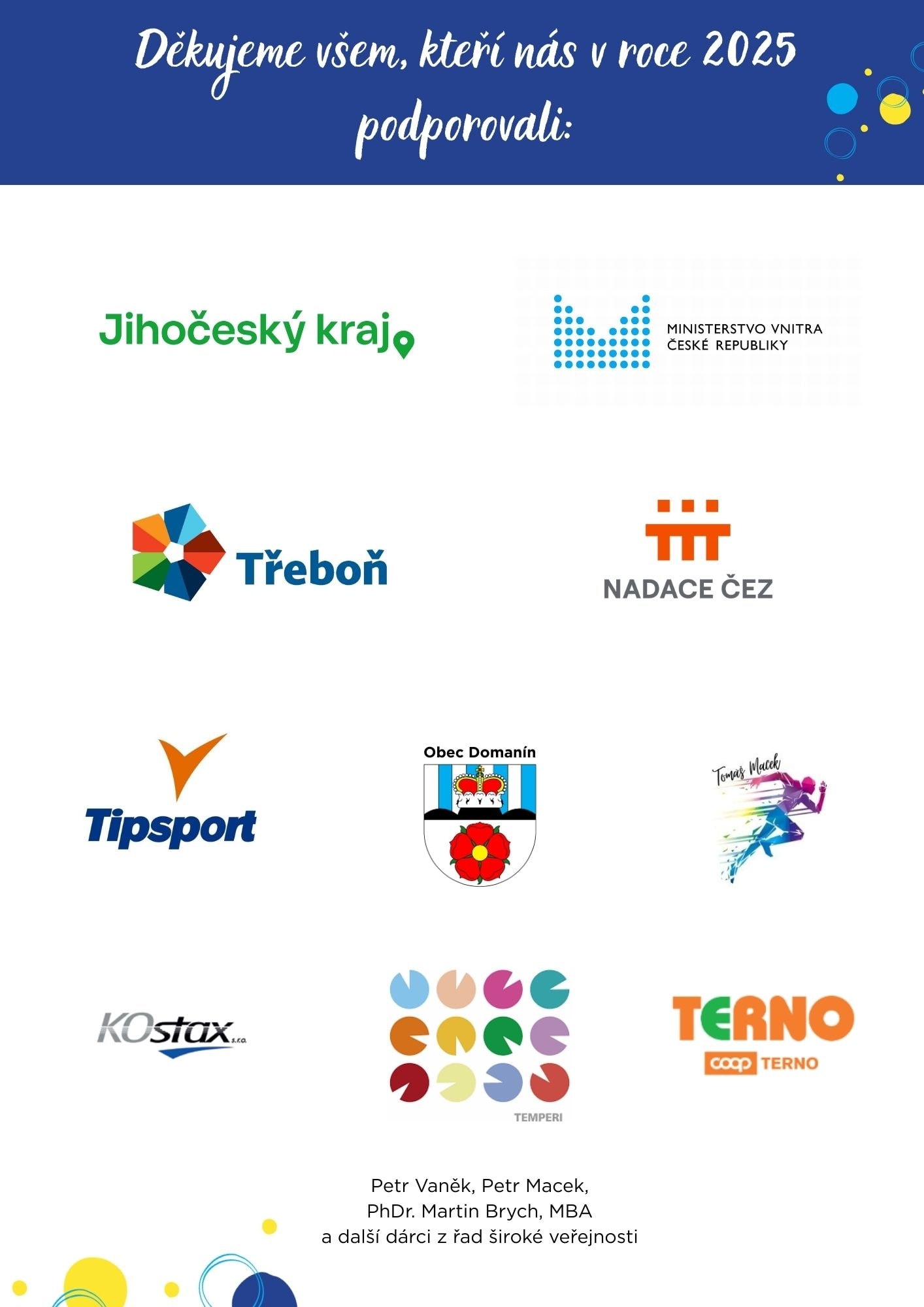 Rádi bychom touto cestou srdečně poděkovali všem, kteří se rozhodli podpořit činnost naší organizace. Díky Vaší pomoci můžeme nadále rozvíjet služby za asistence zvířat a činnost Centra zooterapie, přinášet radost, úlevu i motivaci dětem, seniorům a dalším klientům, kteří naše služby potřebují.