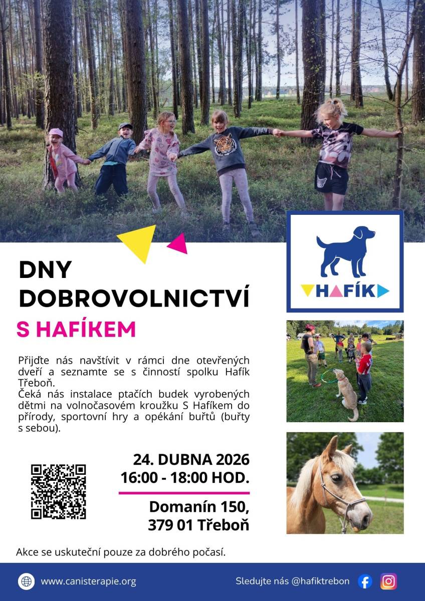 Přijďte se inspirovat a zažít, jak může dobrovolnictví spojovat lidi a přinášet radost! V rámci celostátní akce Dny dobrovolnictví 2026 se můžete setkat s naším milým Hafíkem na dvou speciálních akcích: