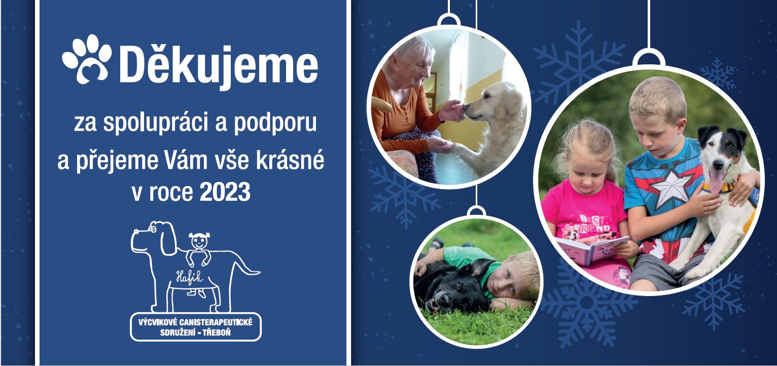 Příjemné prožití svátků vánočních a do nového roku 2023 především pevné zdraví, dobré přátele, mnoho úspěchů a spoustu lásky Vám přejí všichni z Výcvikového canisterapeutického sdružení Hafík, z.s. se svými čtyřnohými kamarády.