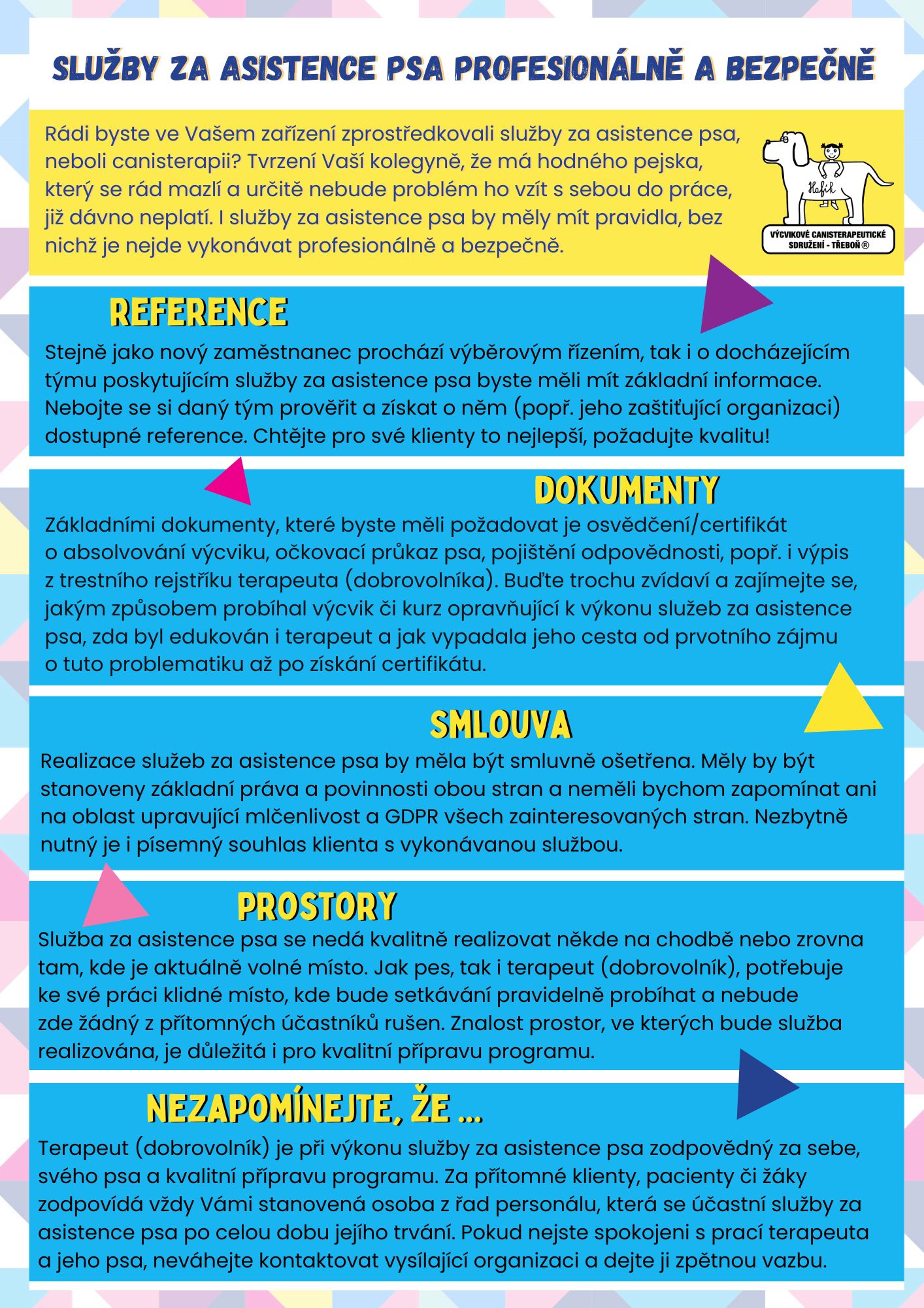 Rádi byste ve Vašem zařízení zprostředkovali služby za asistence psa, neboli canisterapii? Tvrzení Vaší kolegyně, že má hodného pejska, který se rád mazlí a určitě nebude problém ho vzít s sebou do práce, již dávno neplatí. I služby za asistence psa by měly mít pravidla, bez nichž je nejde vykonávat profesionálně a bezpečně. Přečtěte si následující body v naší infografice.