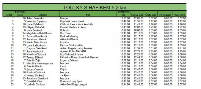 Přestože sobotní předpověď počasí nebyla lichotivá (4°C, silný vítr a celodenní déšť), se na start XIII. ročníku Toulek s Hafíkem postavilo 65 z celkově přihlášených závodních týmů. Stejně jako u předchozích 12ti ročníků, i letos pořadatelé závodníkům připravili krásné trasy, tentokráte v podhůří Novohradských hor. Start byl naplánován z malebné vesničky Petříkov. Jako tradičně byly natrasované 3 okruhy. V kategorii 25 km muži a ženy museli závodníci a závodnice absolvovat okruh měřící 26,6 km. Trasa je provedla přes vesničky Lhotka, Bukvice, Hrádek, Buková a hlubokými lesy zpět do Petříkova. V kategorii 15 km muži a ženy společně na účastníky čekalo 16,4 km, a to směrem ke Kamennému jevišti. Nejkratší tzv. „kočárková trasa“ byla určena nejen pro nejmladší závodníky, ale i pro ty, kteří si prostě jen užívají krás přírody a chtějí si udělat hezký sobotní výlet. Připravený okruh byl dlouhý 5,2 km a vedl k památnému místu U obelisku nad vesničkou Petříkov.