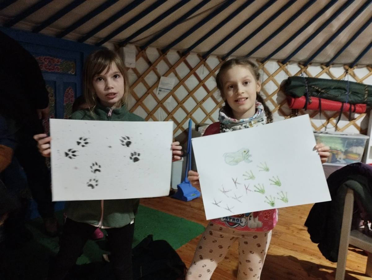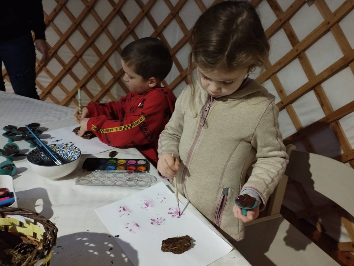 V jurtě jsme se pak zahřáli, odpočinuli si a doplnili energii něčím dobrým 🫖. Děti si vyzkoušely dešťovou hůl, kterou jako správní šamani občas používáme k přivolání deště. Na závěr jsme otiskovali zvířecí stopy 🐾 a z mechu a kůry postavili malé domečky pro lesní tvorečky 🏡🌿 — jako tichý pozdrav zimní přírodě 🤍.